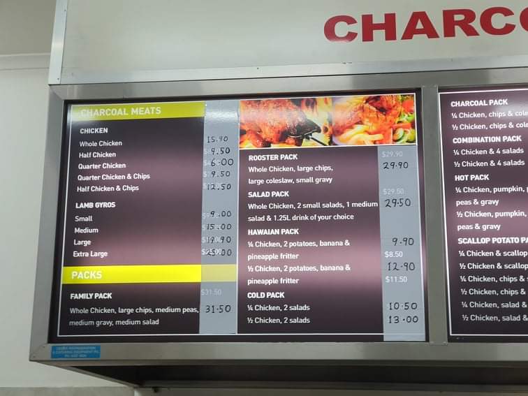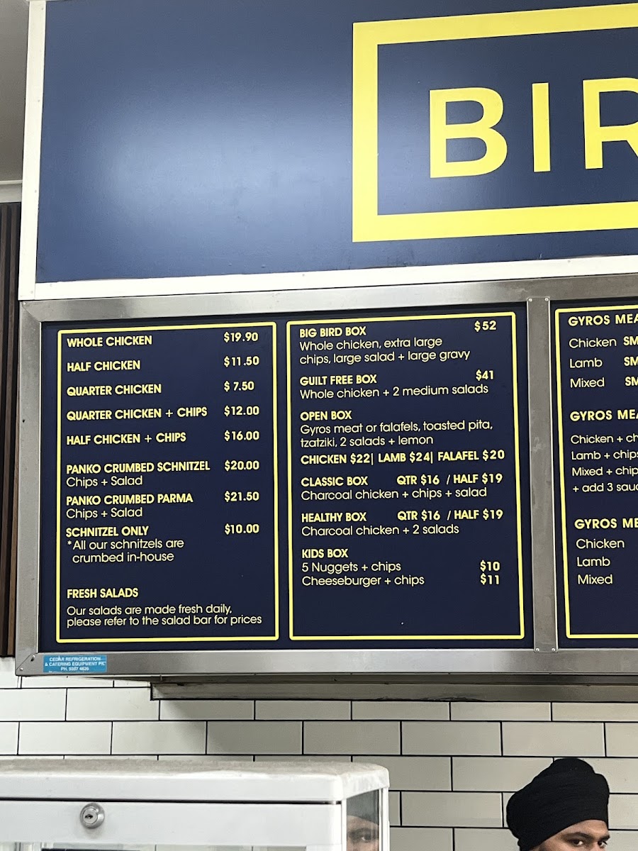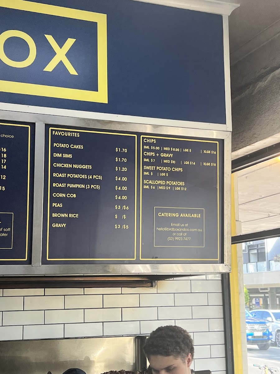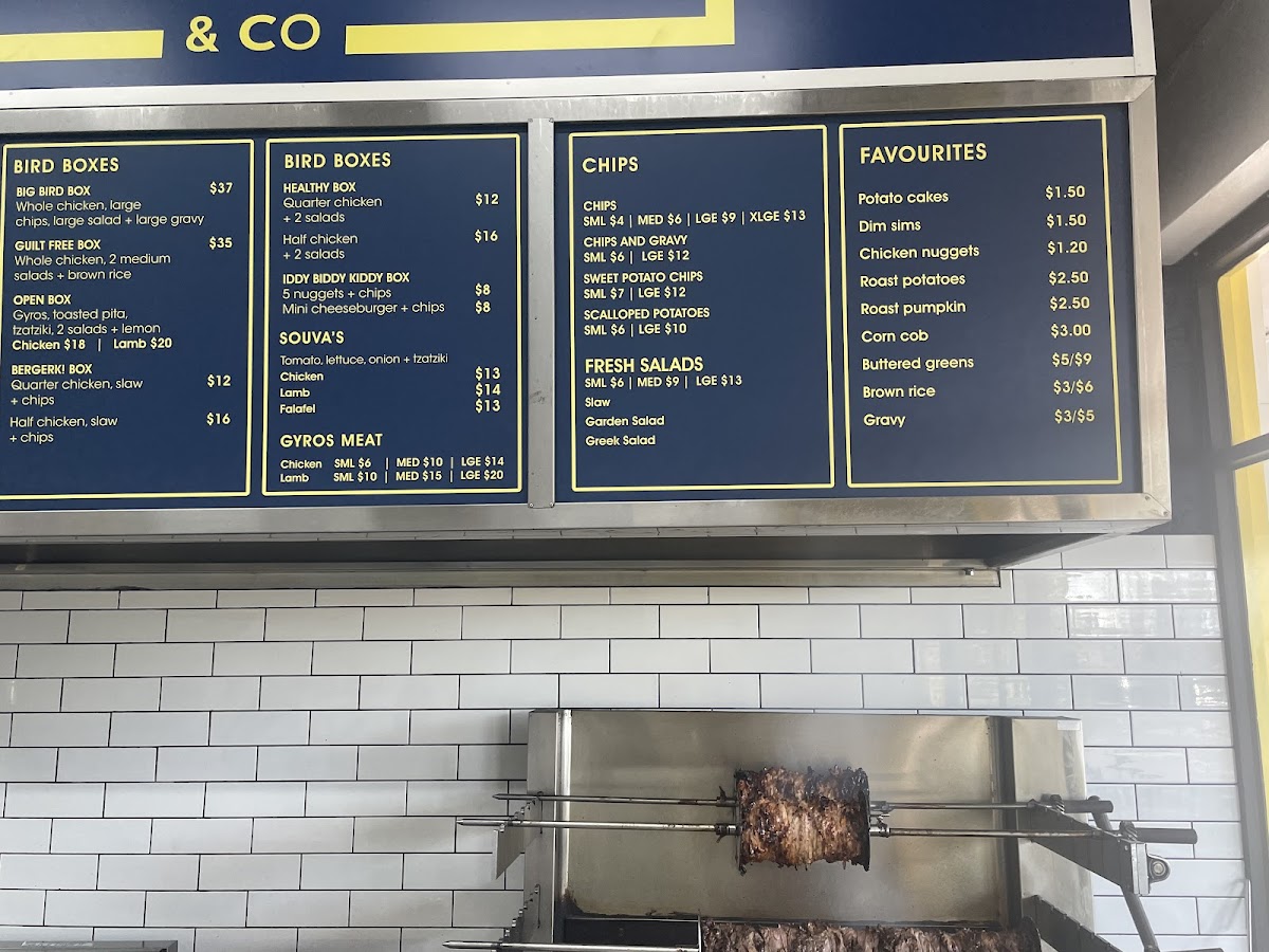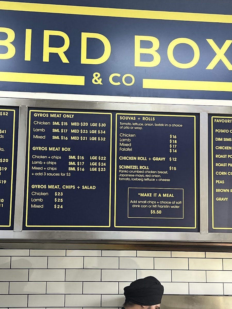 From a reviewer's perspective, the menu at Bird Box & Co, Charcoal Chicken at 139 McKinnon Rd offers a satisfying mix of classic comfort foods and fresh options. Their Favourites section, featuring Potato Cakes, Dim Sims, and Chicken Nuggets, sets the tone with approachable, crowd-pleasing starters. For more substantial meals, the Bird Boxes-including the Big Bird Box, Guilt Free Box, Open Box, and the Bergerk! Box-deliver generous portions in convenient packaging. Those craving sides will appreciate the variety in Chips, from regular Chips and Chips And Gravy to Sweet Potato Chips and Scalloped Potatoes, complemented by hot accompaniments like Peas and Chicken Gravy. Freshness is highlighted in the Fresh Salads, where options such as Slaw, Garden Salad, and Greek Salad provide lighter, vibrant alternatives. The Packs-including Family Pack, Rooster Pack, Salad Pack, Hawaian Pack, and Cold Pack-are ideal for groups or take-home meals, while the Hot Dishes and Others sections round out the menu with hearty choices like Lamb, Mixed, Schnitzel Roll, Chicken, and Chicken Roll + Gravy. Overall, the menu balances indulgent, comforting dishes with fresh and flexible options, making it a versatile destination for both casual dining and take-away.